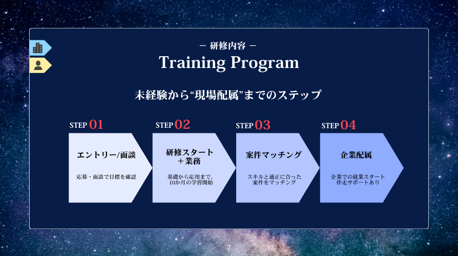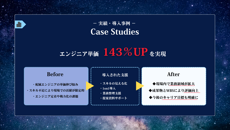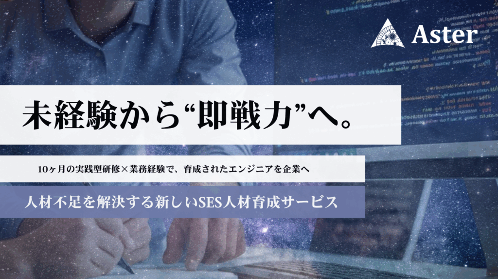 株式会社AsterのSES人材育成サービスの概要資料です。私たちの強みやサービス概要、提携SES企業様にとってのメリットについて紹介しています。1年で月45万円の高単価人材へと成長した実例なども掲載。